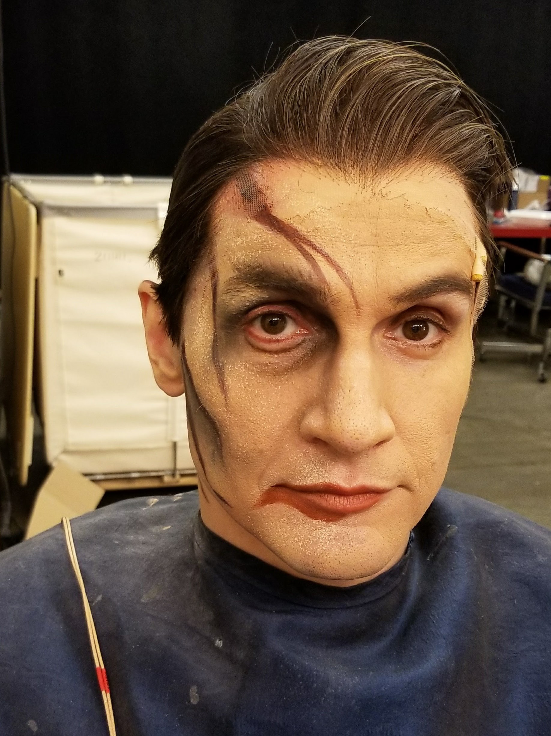 Phantom / Eric Y. makeup and bald cap application while teaching crew person on 1st National Tour of Love Never Dies